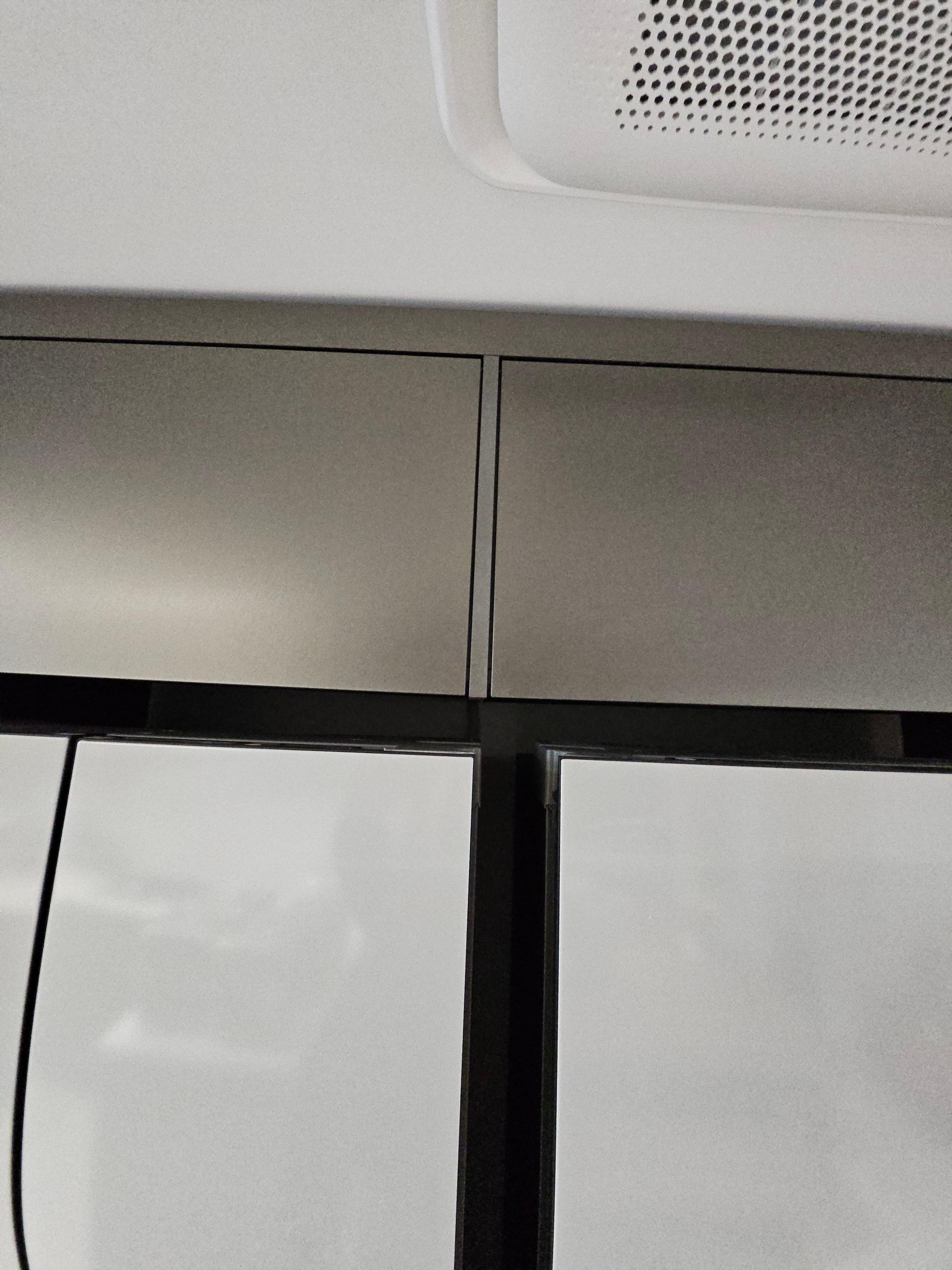 이런 경우 냉장고장 가운데 기둥을 절단해서 제거하면 간격이 넓어지고 여유가 생겨 좀 더 안으로 들어갈 수 있습니다. 그런데 가운데 기둥 역할을 하는 판을 절단하면 상부장이 처질 수 있기 때문에 보강 작업을 필수로 해줘야 합니다. 냉장고장 가운데 기둥 절단과 상부장 보강을 위해서 먼저 상부장 문짝을 해체합니다.