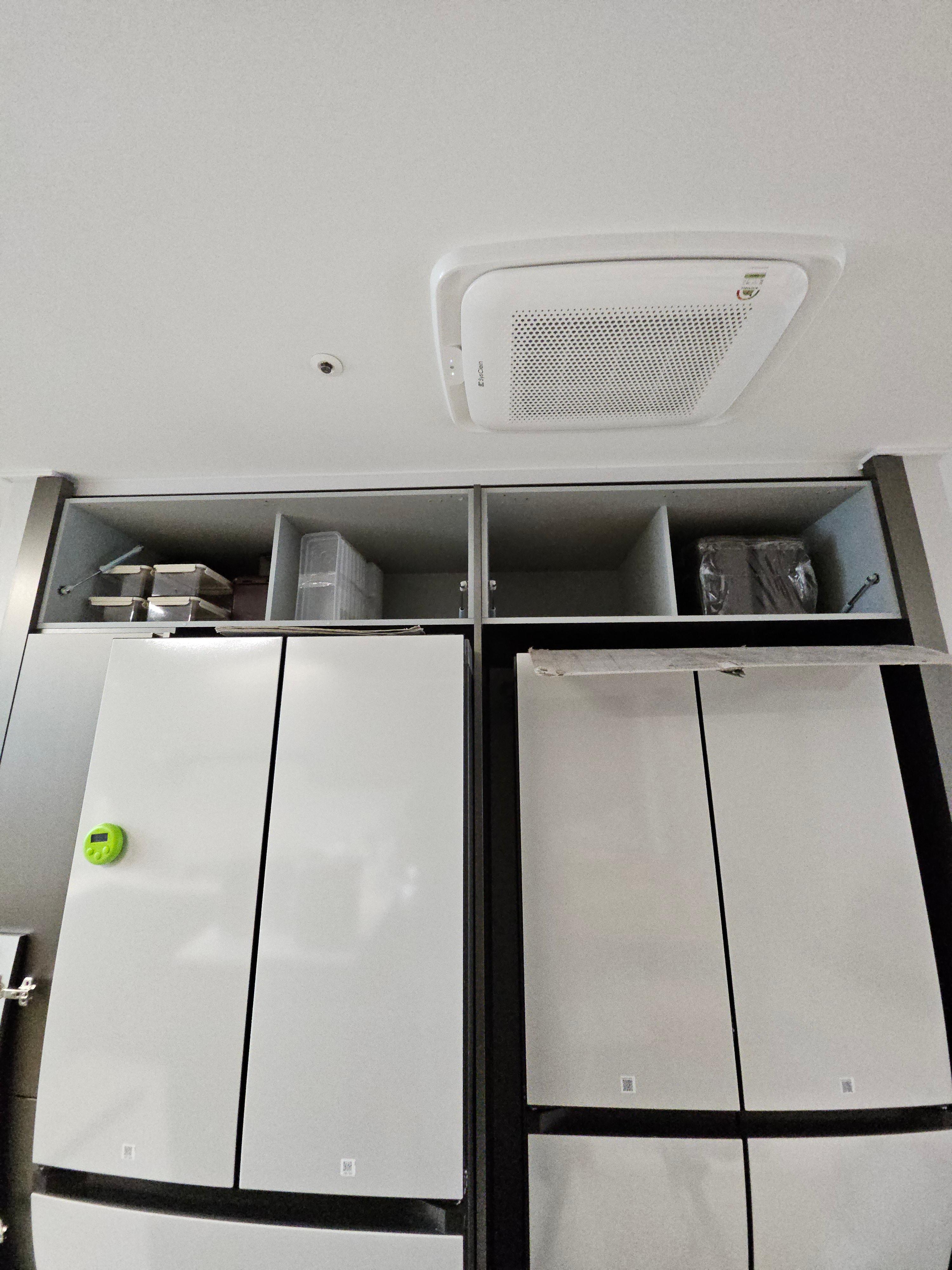 냉장고장 가운데 기둥 절단 제거 리폼 작업이 완료되었습니다. 가운데 기둥과 상부장 문짝 라인에 맞춰서 절단하여 반듯하고 깔끔합니다.
