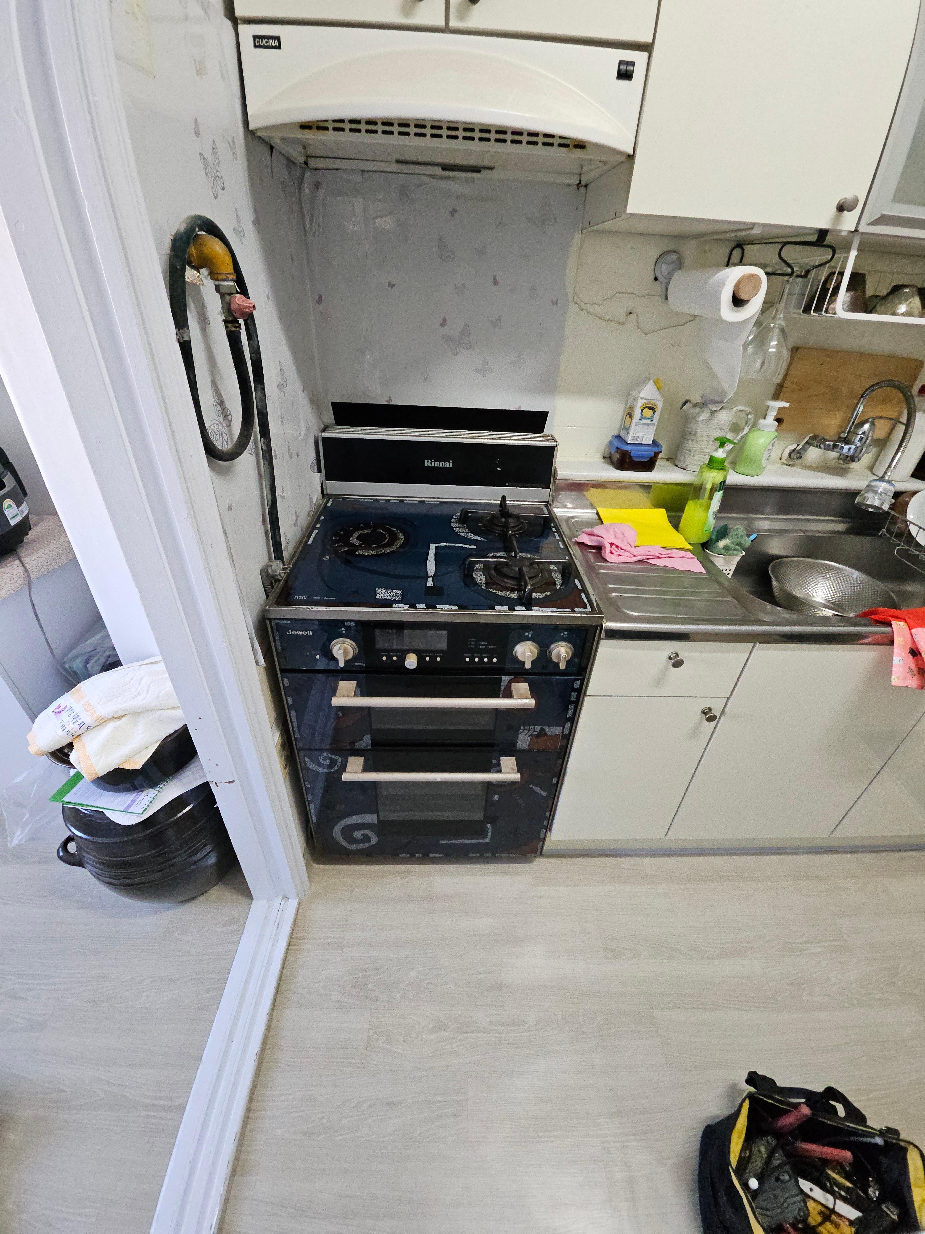 오래된 빌트인 가스 오븐 레인지를 철거한 모습입니다. 일체형의 가스 오븐 레인지이기 때문에 무게가 많이 나가서 엘리베이터가 없다면 미리 고지를 해주셔야 합니다. 2층인데 계단으로 내려가려면 2명이 필요하기 때문입니다. 아니면 폐가전을 수거하는 업체에 따로 요청하셔야 합니다.