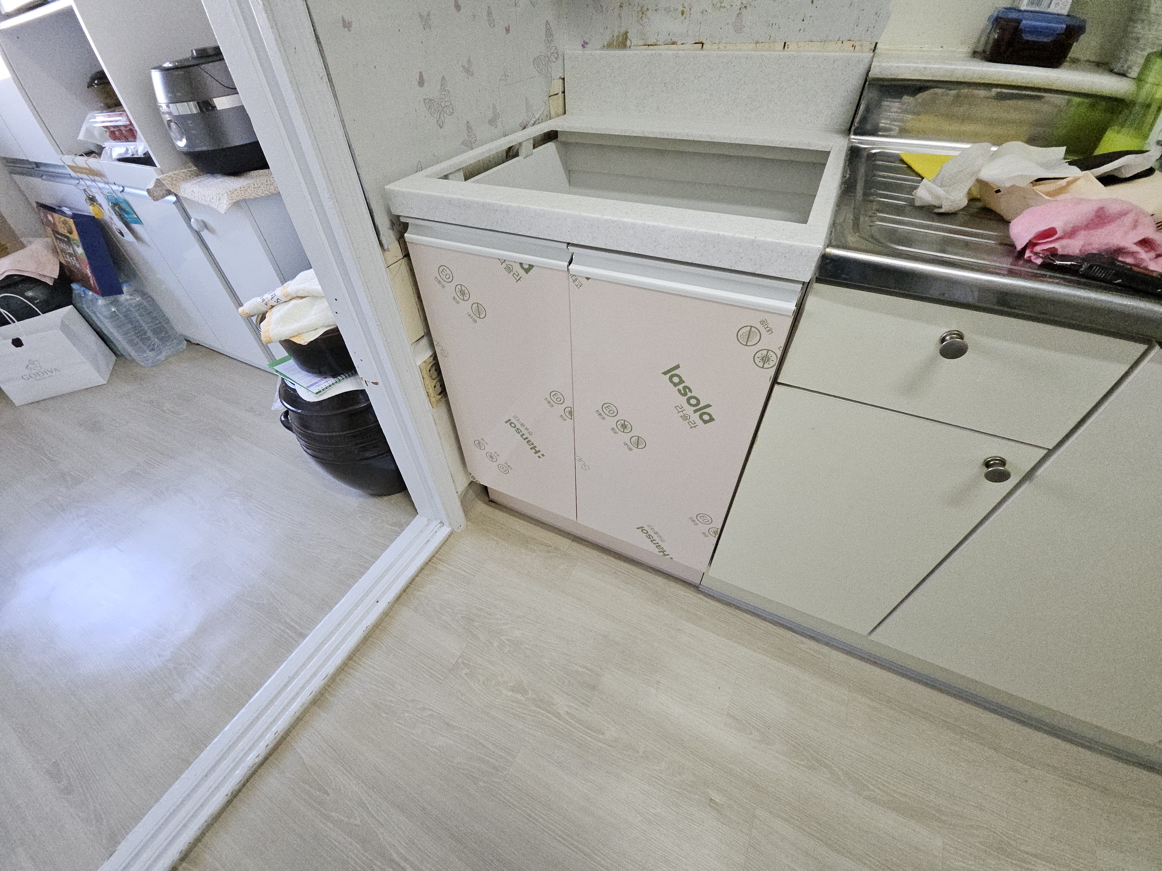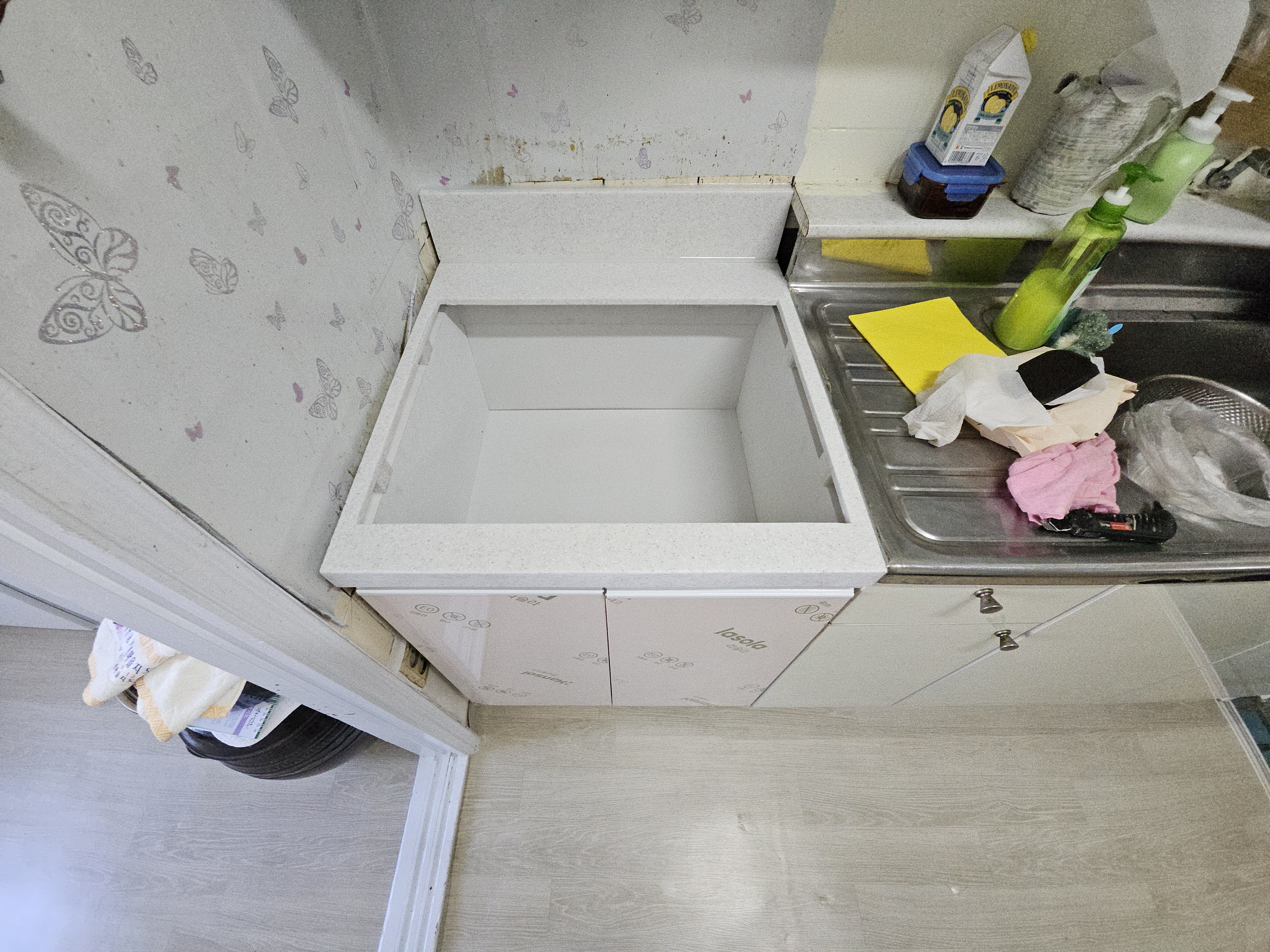 오래된 빌트인 가스 오븐 레인지 인조대리석 상판 하부장으로 교체