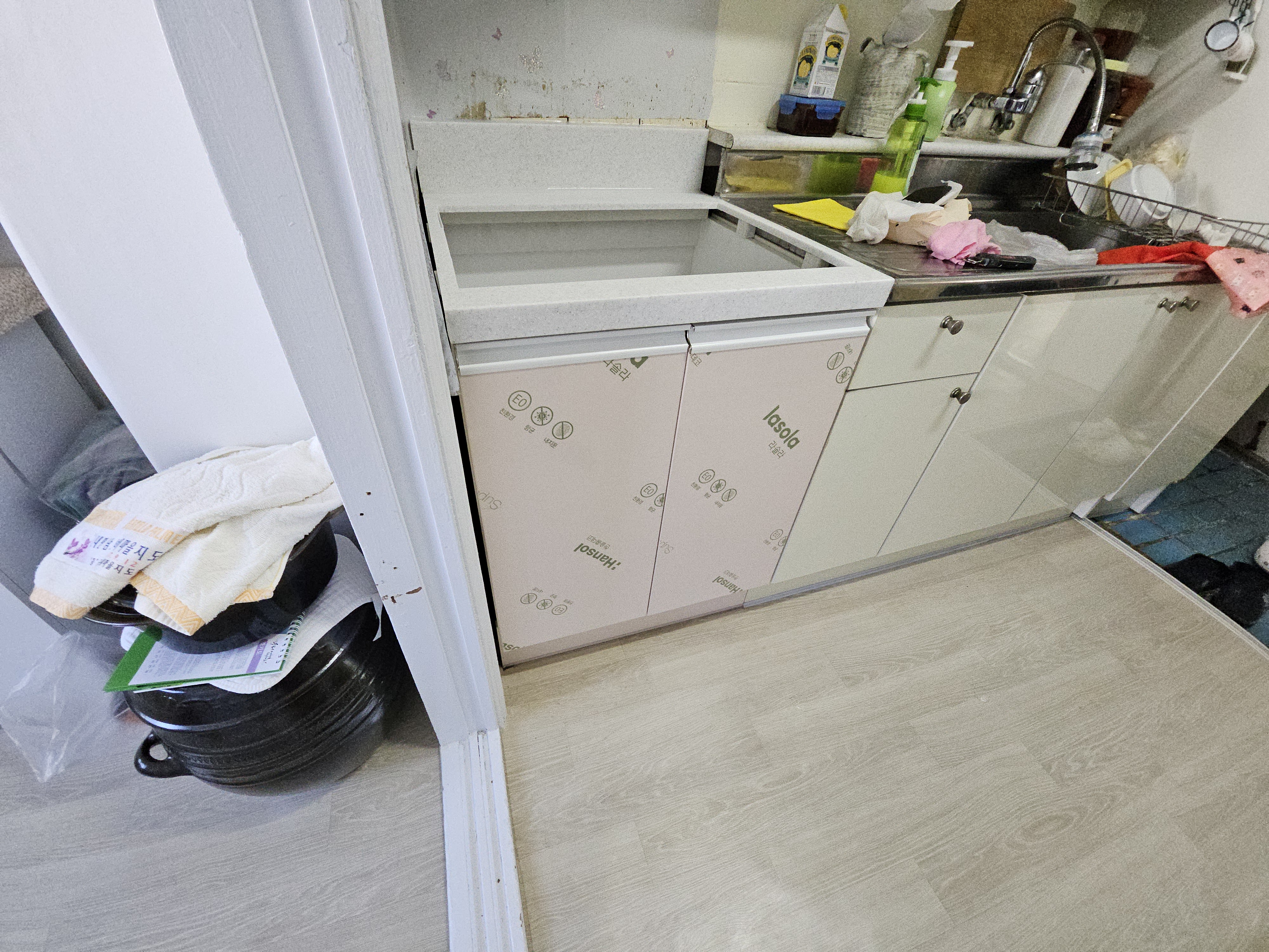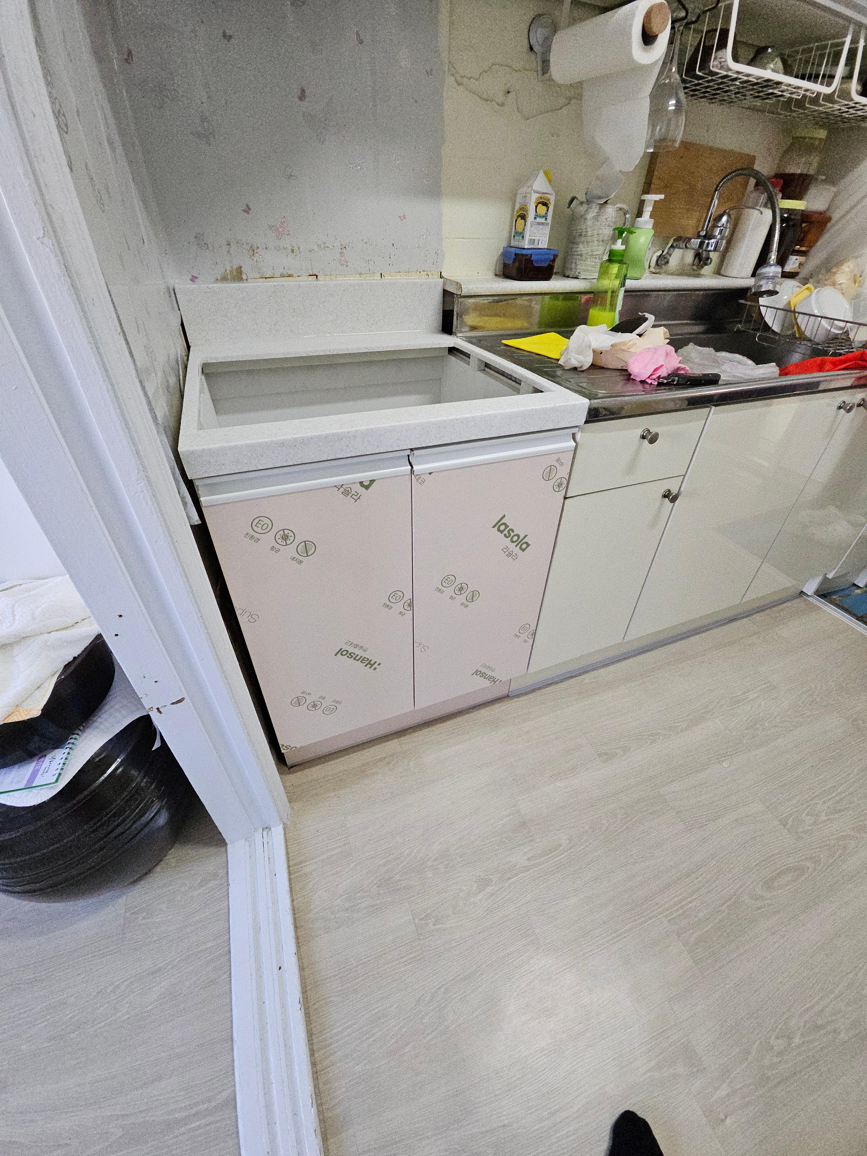 빌트인 가스 오븐 레인지를 철거한 자리에 인조대리석 상판과 하부장으로 교체하였습니다. 기존 싱크대가 스테인레스 재질 상판이라 색상이 다르지만 높이는 똑같이 수평을 맞춰드렸습니다. 문짝 색상은 기존 문짝이 변색되어서 똑같이 맞추는 건 불가능하기 때문에 로지핑크라는 색상으로 고객님이 선택하셨습니다. 다만, 현재 이 색상은 단종되었으니 참고하시기 바랍니다. 그리고 손잡이도 기존과 달리 문짝 일체형 손잡이로 설치되었습니다.
