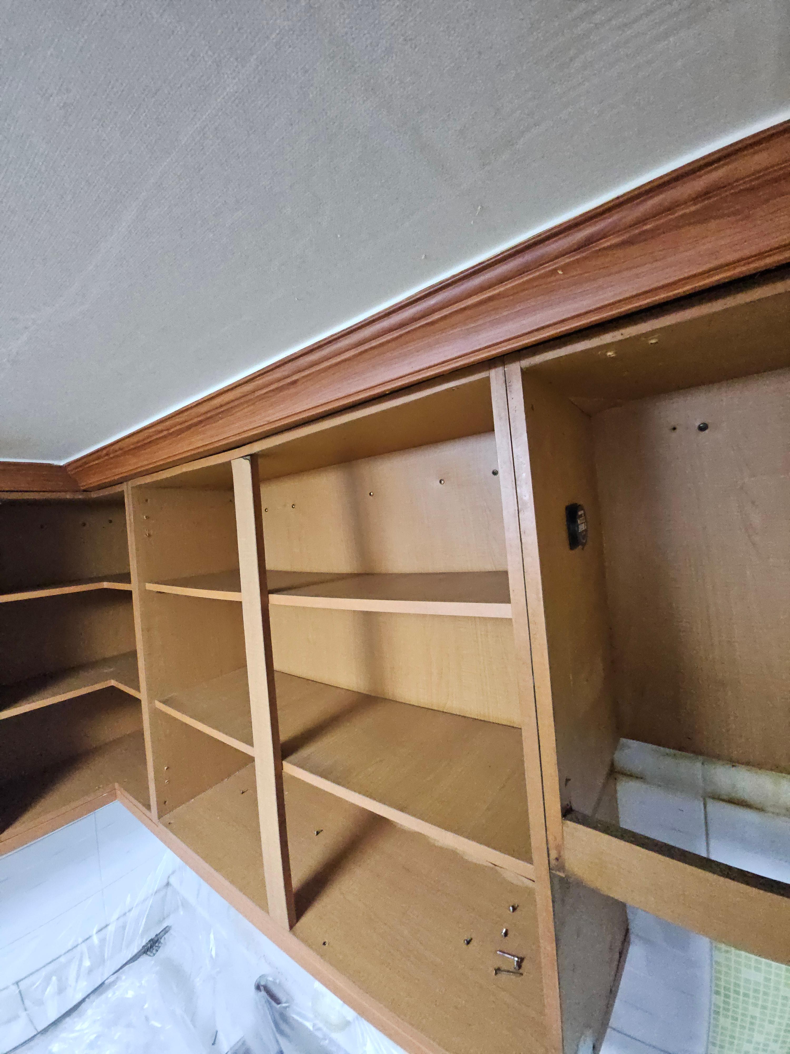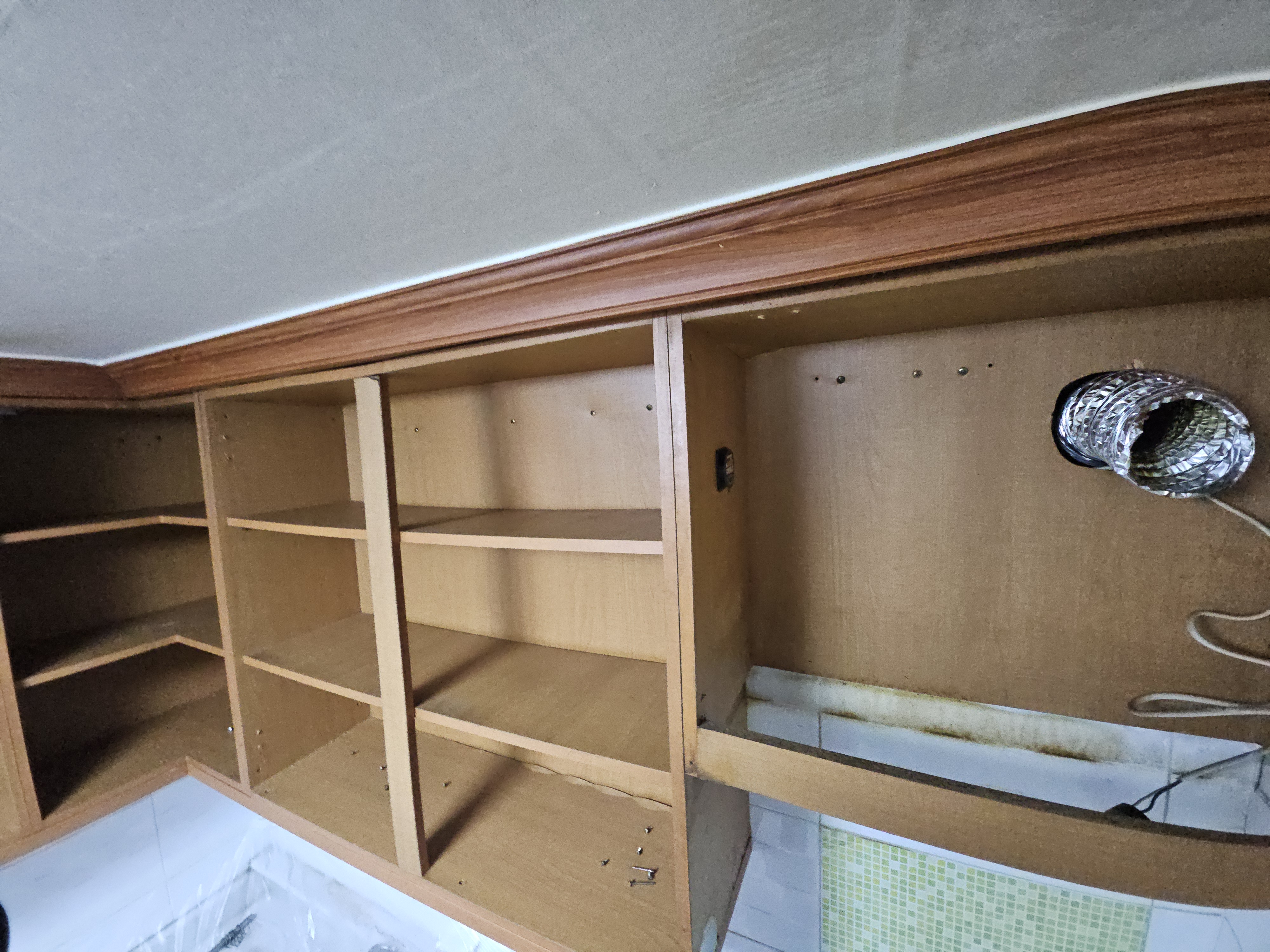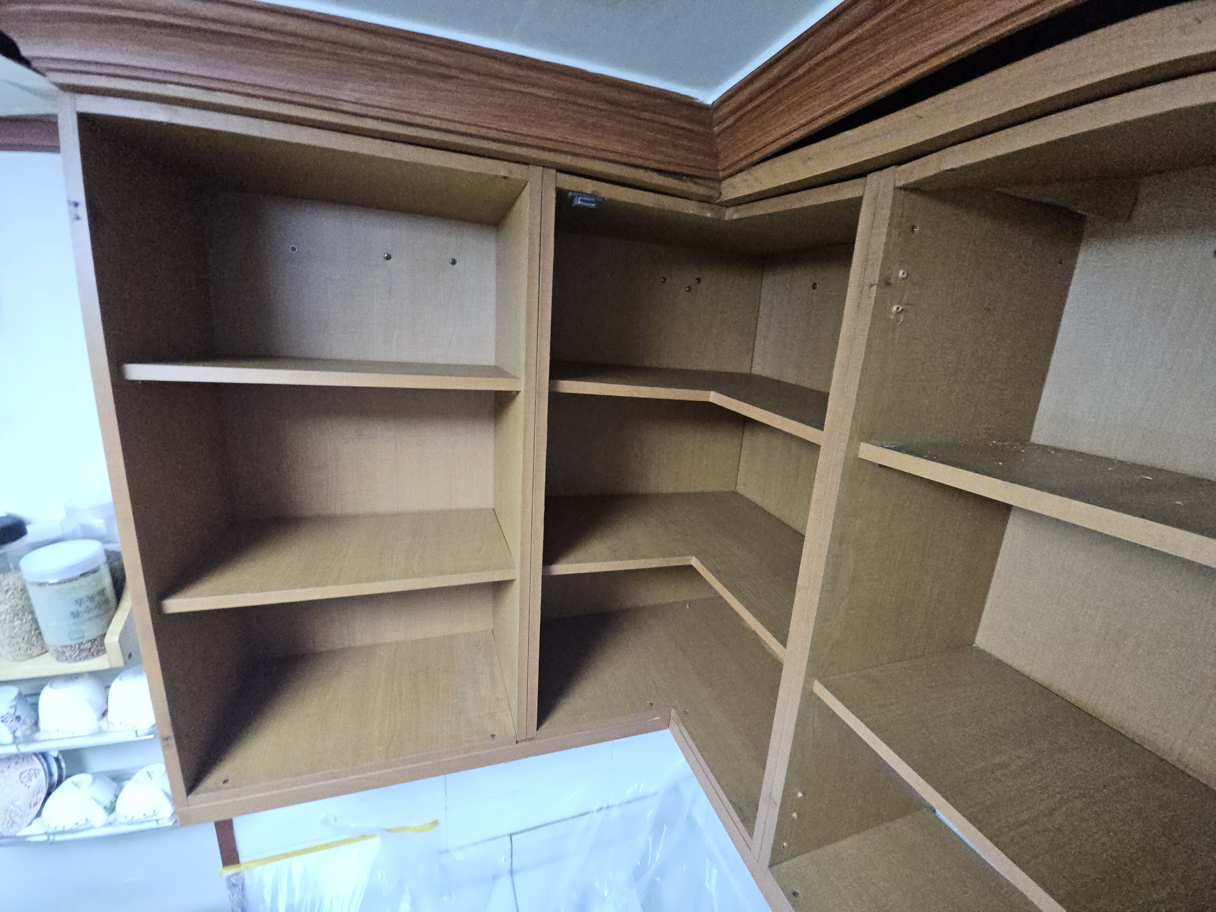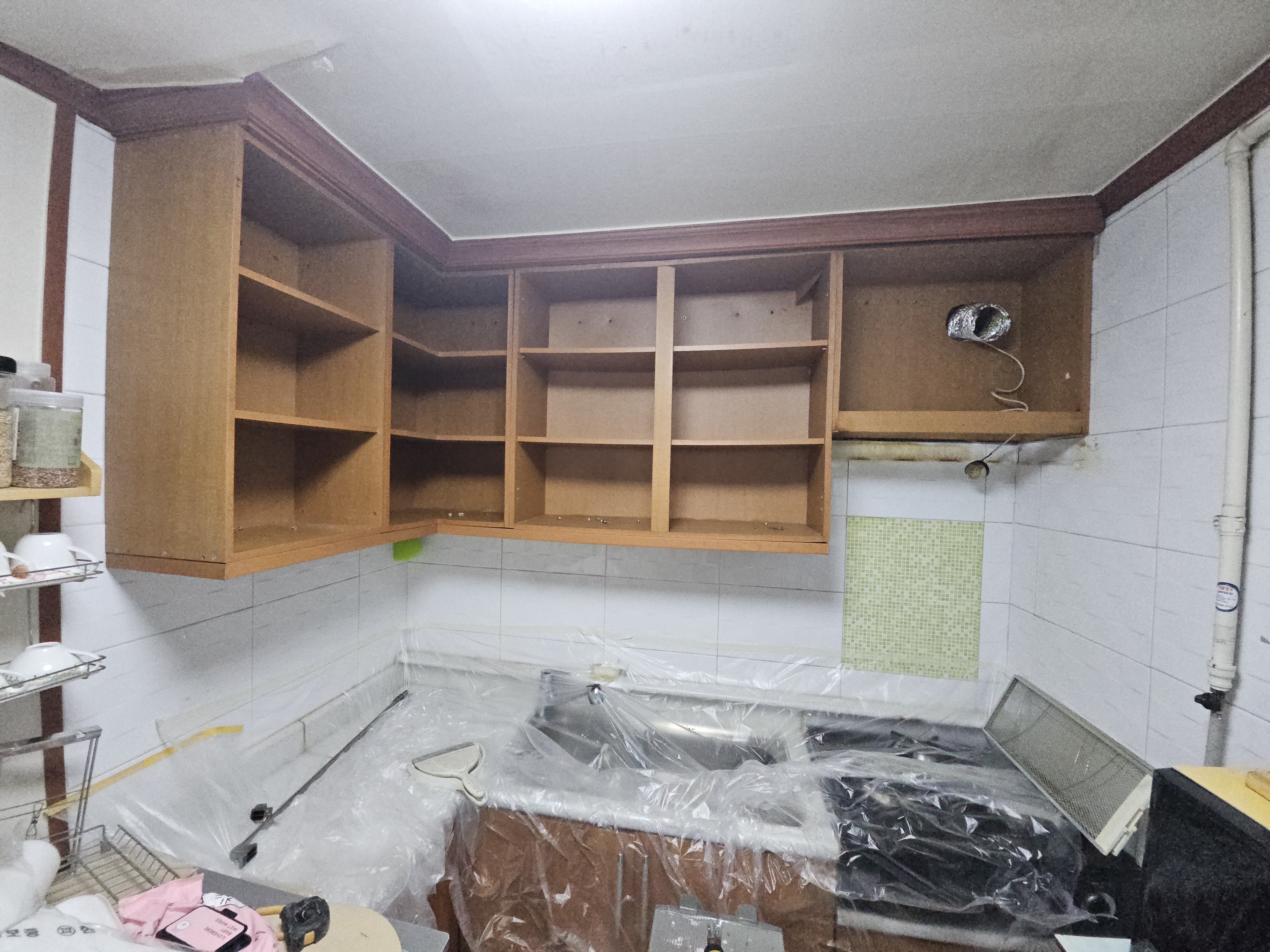 상부장을 전부 철거한 모습입니다. 가로로 길게 설치되어 있는 고정목은 비교적 양호했지만 약간의 보강 수리가 필요했습니다. 고정목과 상부장을 보강 수리하고 재설치를 진행합니다.