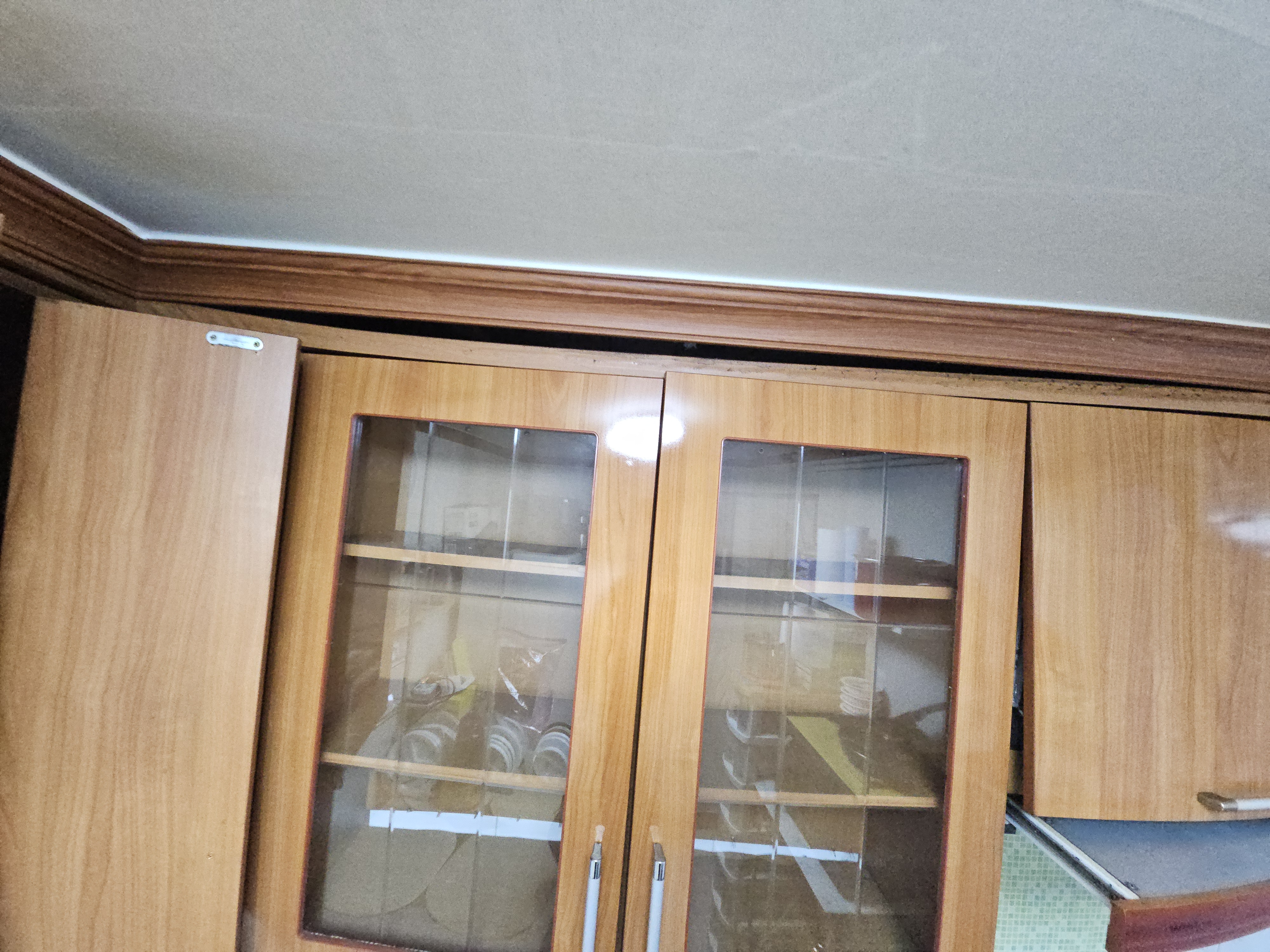 먼저 상부장 문짝을 전부 철거합니다. 상부장이 떨어질 수도 있으니 무게를 줄여야 합니다. 상부장이 휘어진 것 같은 것처럼 보이는데요. 자세히 살펴보겠습니다.